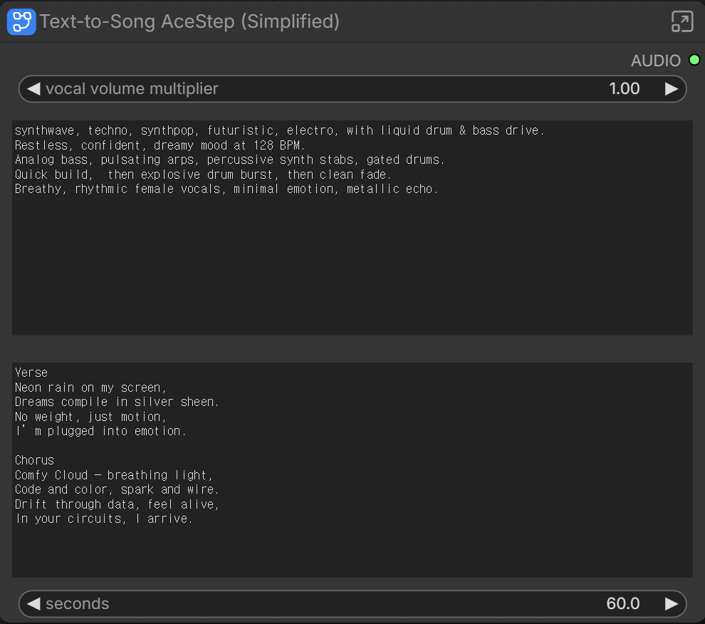 Text-to-Song AceStep (Simplified)와 오디오 저장 (MP3), 단 둘 뿐이다.