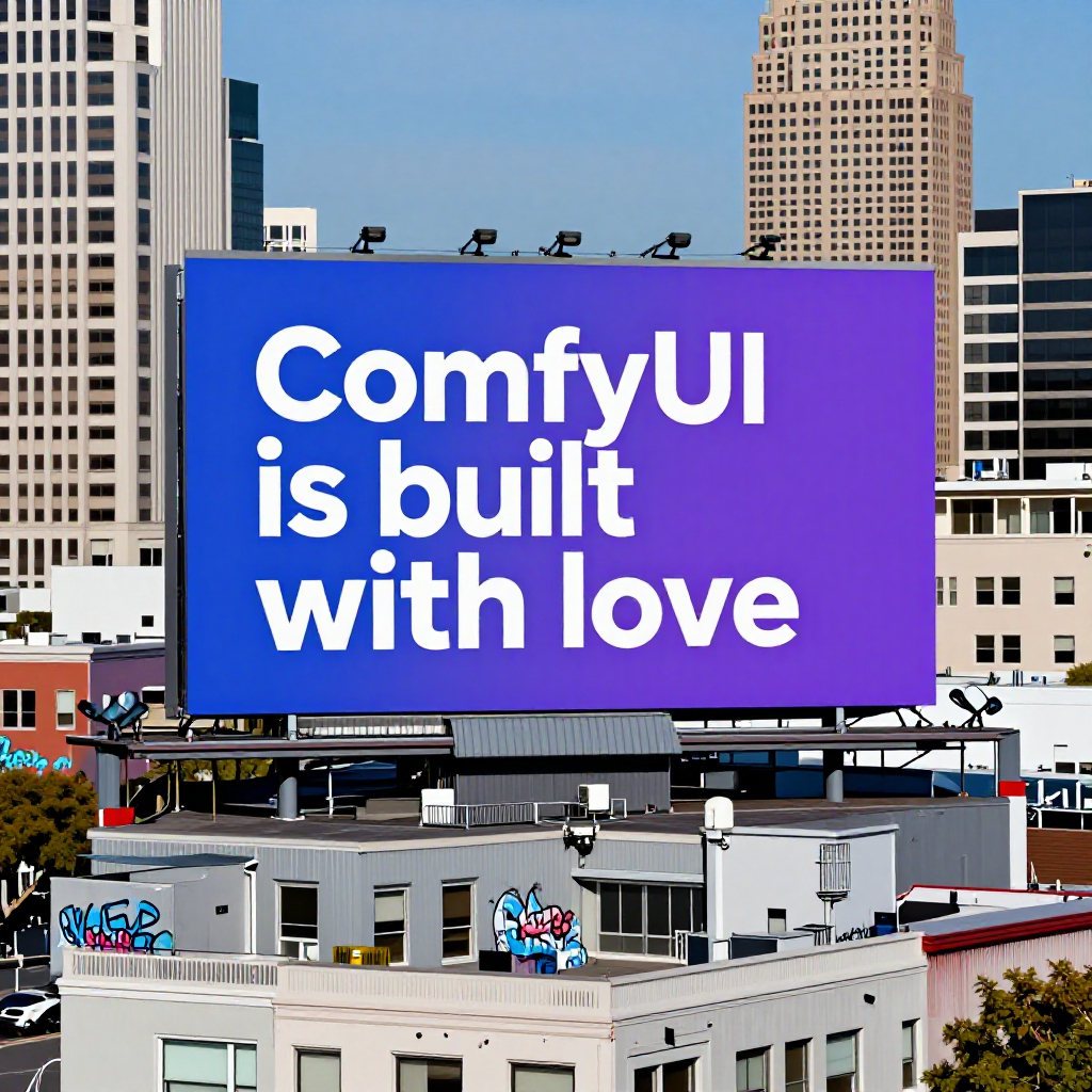 Prompt: Giant blue and purple big billboard on rooftop in san francisco city billboard says "ComfyUI is built with love" All kinds of buoildings in different shapes and colors. Some buildings have grafitti "We" "Here" "Today"